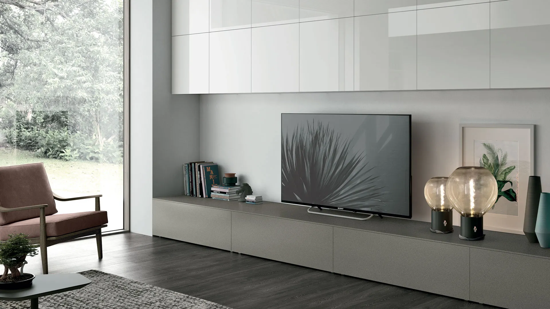 Parete attrezzata con Pietra Neolith® Cement Satin e vetro Frost lucido.