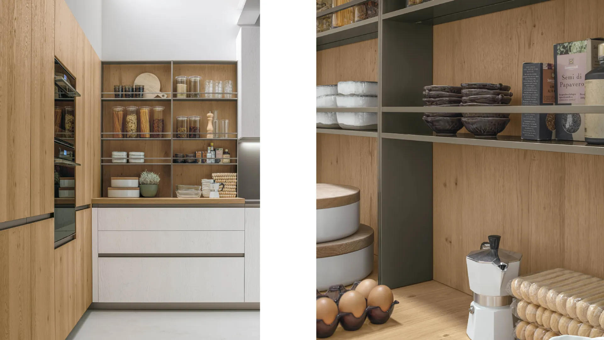 Schienale in Rovere Miele, in appoggio sul top, con sponde in metallo finitura Titanio.